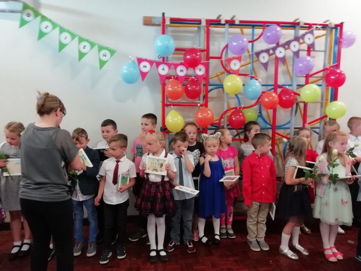 Mamusie i tatusiowie nagrodzili swoje pociechy gromkimi brawami. Na zakończenie dzieci złożyły swoim najbliższym osobiste życzenia i obdarowały ich własnoręcznie wykonanymi upominkami i kwiatami.