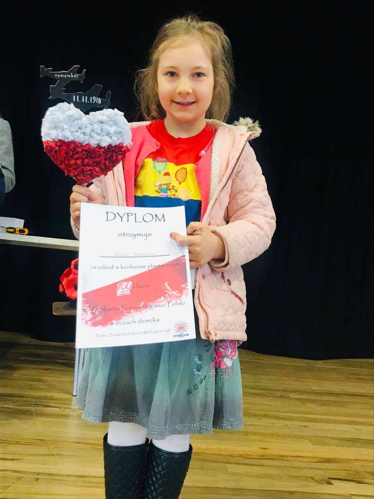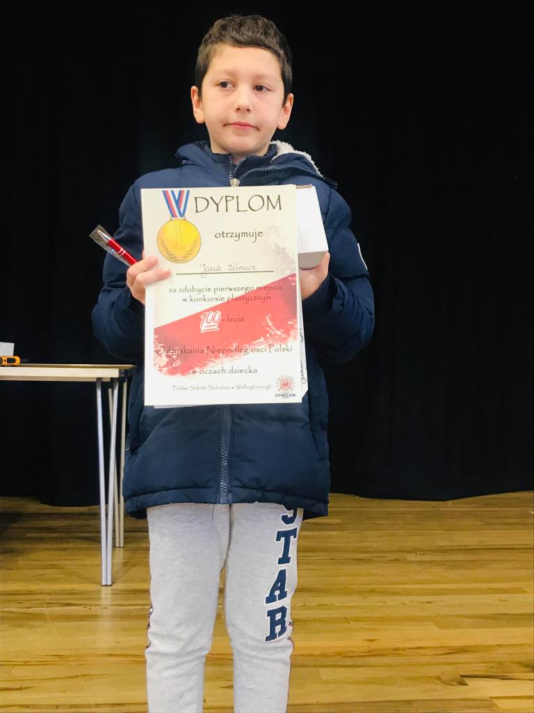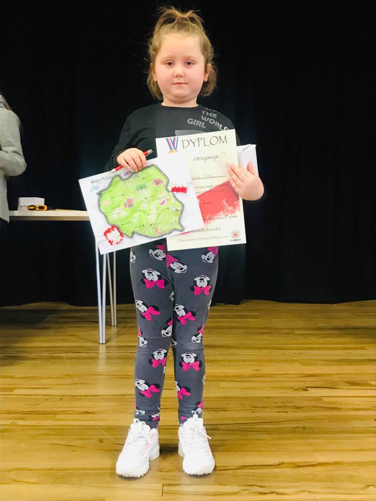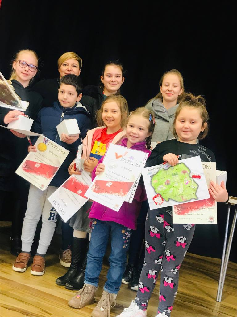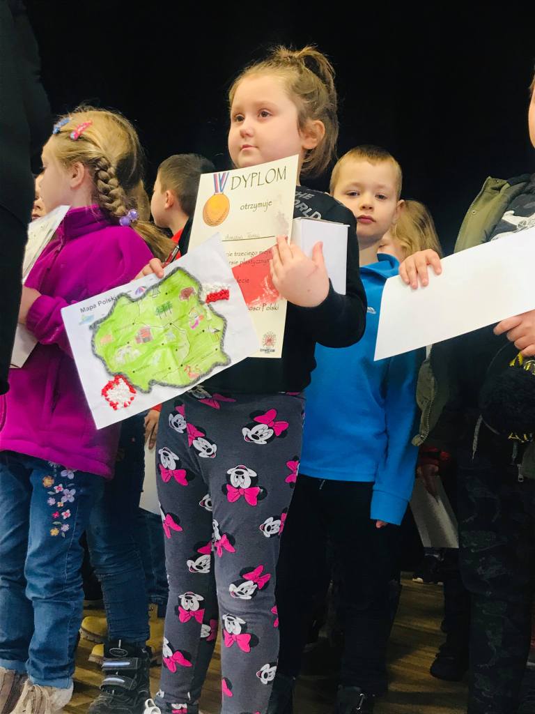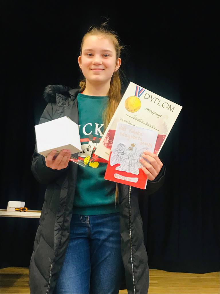 Komisja przyznała również dwa wyróżnienia, które powędrowały do Liliany Sapażnikow za piękne godło, oraz Zosi Ekstowicz za równie piękną mapę Polski. Obie prace pozostaną w szkole i będą nam towarzyszyły podczas oficjalnych uroczystości.
