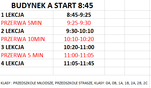 Uczniowie podzieleni są na trzy grupy A, B i C. Grupa A rozpoczyna zajęcia o godzinie 8:45, grupy B i C o godzinie 9:00. Prosimy o zapoznanie się z tabelką poniżej.